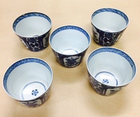 藍の色の美しさの残る古伊万里、角福印のそば猪口5客です。